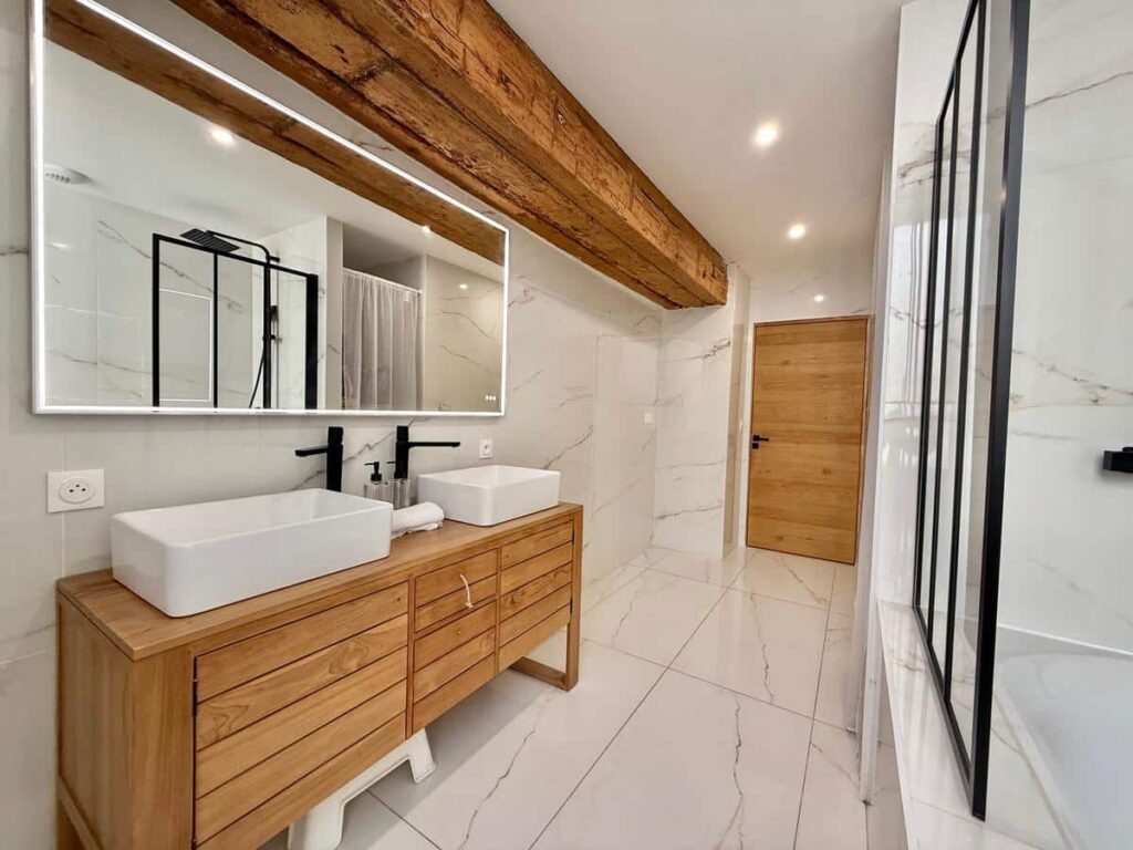 Charme de l’ancien avec poutres apparentes, hauteur sous plafond de 3 mètres et double vitrage.