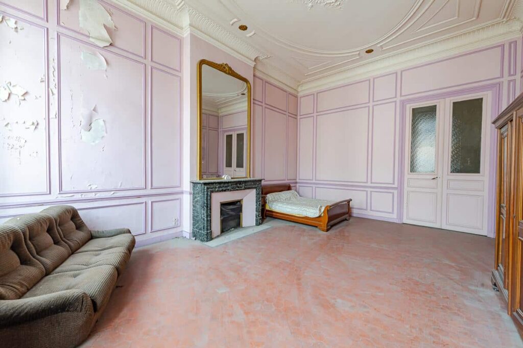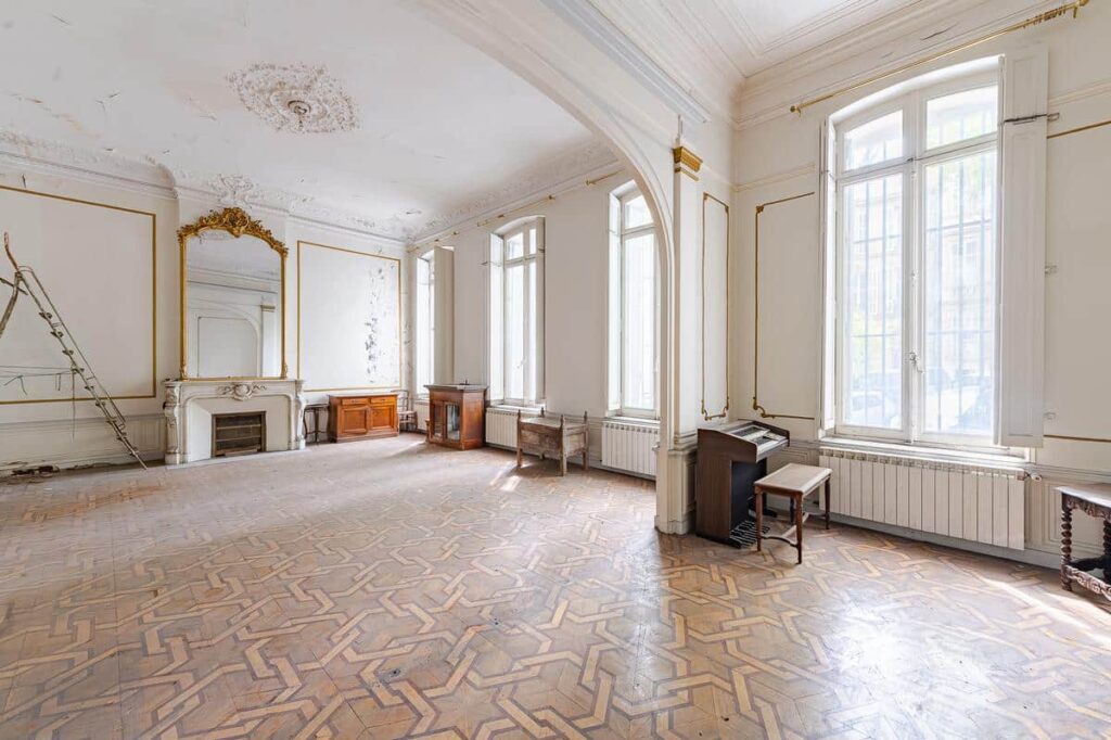 Volume des pièces, grande hauteur et moulures sous-plafond et murales, fenêtres hautes, parquet marqueté et cheminées en miroir dans le salon d'apparat, balcon privatif à l'arrière donnant sur un cour intérieure en contrebas (cour commune à la copropriété).
