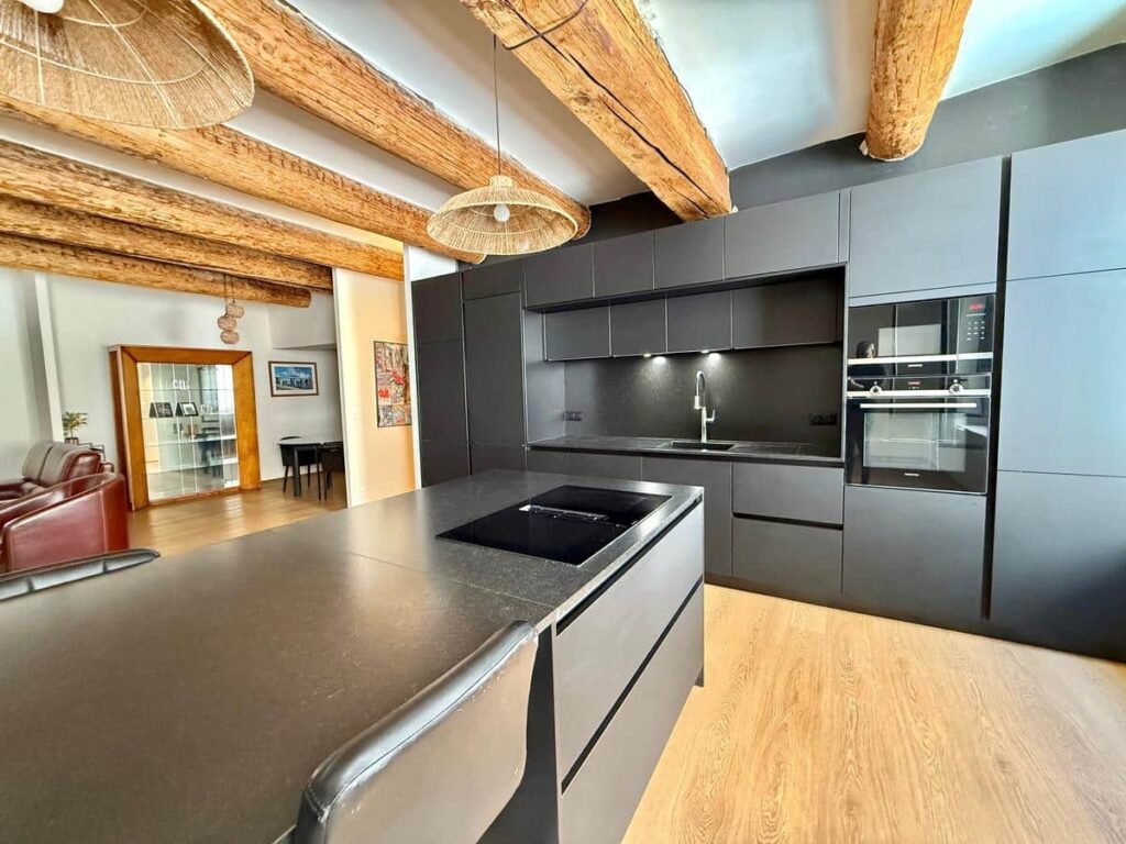 Charme de l’ancien avec poutres apparentes, hauteur sous plafond de 3 mètres et double vitrage.