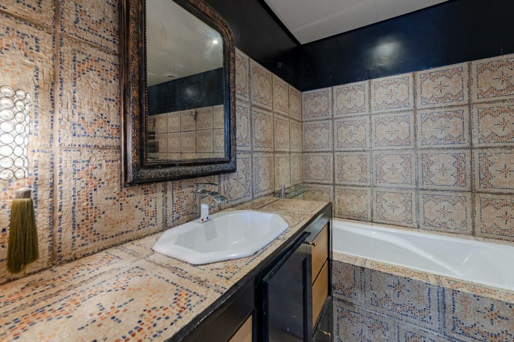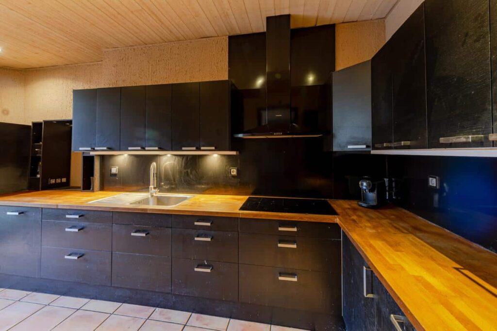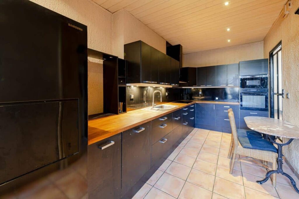 Cuisine avec office, buanderie, petit extérieur, une salle d'eau une salle de bains.