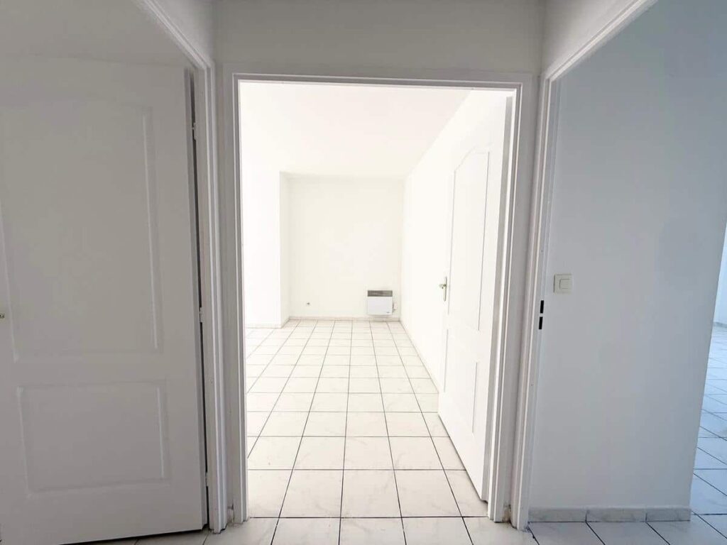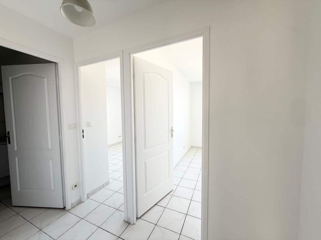 Un couloir menant à deux chambres spacieuses dont une avec placard encastré, une salle de bains, wc séparés, dégagements.